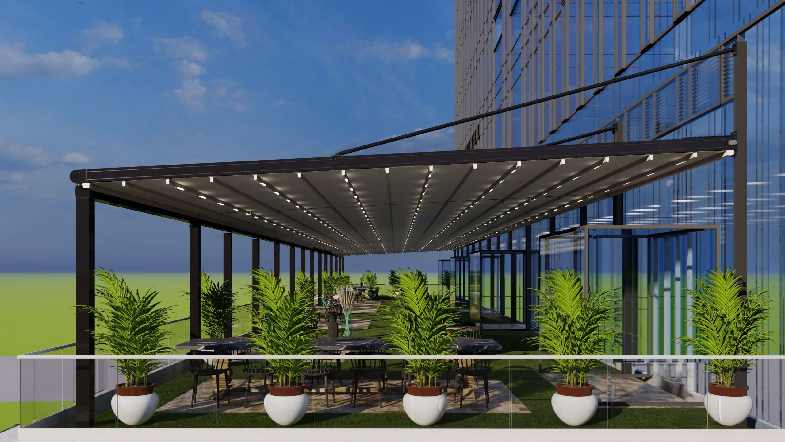 Trong bối cảnh đô thị hóa nhanh chóng tại TP.HCM, nhu cầu tối ưu không gian sống và kinh doanh trên cao đang trở nên phổ biến hơn bao giờ hết. Các nhà hàng, quán cà phê trên tầng thượng các tòa nhà cao tầng không chỉ cần đẹp về thiết kế mà còn phải chứng tỏ tính an toàn, bền vững và linh hoạt trước tác động của thời tiết khắc nghiệt. Trong xu thế đó, hệ mái bạt xếp cao cấp trở thành lựa chọn đầy thuyết phục cho các dự án nhà hàng trên cao.
